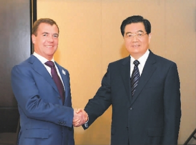 梅德韦杰夫说,非常高兴时隔不久同胡锦涛再次见面。俄中两国元首频繁会见和接触,充分显示两国战略协作伙伴关系的高水平。今年两国还将举行很多重要活动,希望双方共同努力使这些活动取得成功。双方在二十国集团框架内进行了良好合作,俄方愿同中方继续加强协调和配合。梅德韦杰夫表示,他期待着今年9月对中国进行访问。