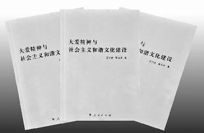 另一个是对大爱精神与和谐精神关系的分析,认为大爱精神是社会主义和谐文化、和谐精神的精华。在一般意义上,社会主义和谐精神是以和谐为根本价值取向,集“诚信、爱心、责任、包容、公平、正义”等基本要素于一体的思想价值体系,蕴含着丰富的“爱”的元素,与以人为本的社会主义大爱精神之间具有内在的理念契合和价值趋同。从最高的价值取向上看,社会主义大爱精神在本质上归属于时代精神的范畴,是社会主义和谐精神的重要组成部分和大众化的表现形式,是具有坚实群众基础、深厚文化土壤和鲜明时代特色的真正意义上的社会主义和谐精神。当其延伸至社会主义和谐文化甚至是社会主义先进文化的领域中,社会主义大爱精神自然就如同社会主义和谐精神一样,作为社会主义和谐文化的精华而存在,作为构建社会主义和谐社会的思想基础和精神源泉而存在。唯一不同的是,它更加突出“爱”在和谐中的核心作用,更加强调人际和谐的中心地位,更加注重“爱心与责任”的功能发挥。