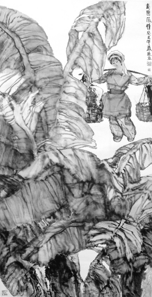 蔡超在笔墨结构的千变万化中悟得写意笔墨气韵的味道和精神内涵,又进一步将这笔墨技巧运用于现代人物和现代生活情境的塑造,形成了远较其工业题材技巧丰富的意写笔墨画风。他在偶然的实验中发现了破墨的特殊效果,便将其广泛运用于人物尤其景物的描绘,淡墨之后的浓墨枯笔,浓墨之后冲水的渍墨洇晕,产生了神奇动人的趣味,使荷塘、蕉荫、树林更富诗意,更加迷人。