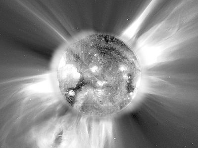 | 太阳观测卫星拍摄的太阳发射的X射线像显示:明亮区域是太阳大气中的一些温度偏高的区域,靠近太阳边缘的亮区是正开始爆发的太阳风暴。 |