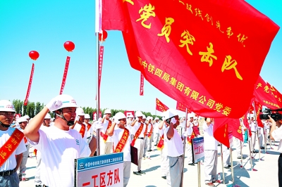 | 6月28日上午10点30分,在中国西部最长的高标准铁路建设项目——新建兰新铁路第二双线新疆著名的百里风区哈密红星梁场的工地上,鲜红的党旗迎风飘扬。中铁四局集团庆祝建党89周年暨“戈壁滩上党旗红 四强四优争先锋”授旗仪式在这里举行。近400名党员建设者庄严宣誓:“建一流铁路,为党旗增辉!” 本报通讯员 胡效民、舒郁仁摄影报道 |