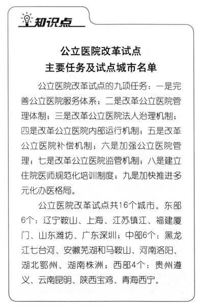 一年多来,中央投入200亿元支持基层医疗卫生机构建设,在岗培训基层医疗卫生人员;制定《关于公立医院改革试点的指导意见》并在16个城市开展试点。到2011年,每个县至少有1所县级医院基本达到标准化水平,共新建、改造14700所城市社区卫生服务机构,为基层培训医疗卫生人员189万人次;公立医院将逐步取消药品加成,明显提高服务质量和效率,形成多元办医格局。