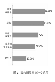 网民的虚拟社交网络很大程度上是其在现实世界中社交网络的移植。调查结果显示,网民进行网络社交的对象主要是其现实生活中的同事、同学、朋友、亲戚或家人,与这些人群进行网络交往的网民比例分别达到88.4%、85.9%、70%;排在其后的是与现实中有业务或工作关系者的网络交往,比例为61.3%;与陌生人交往的网民比例最低,仅占全部网民群体的37.7%。人们通过长期亲身接触而建立起来的现实社会关系具有一定的维系力。仅从目前国内情况来看,现实社会交际关系对网络社交的影响是非常显著的。网民主要的网络社交行为都发生在其现实交际圈内,通过网络与陌生人建立联系、拓展新社交网络的程度总体上较为有限。