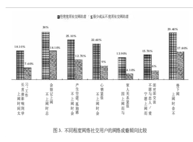 调查结果显示,目前国内网民的网络社交行为与网络成瘾之间存在显著的相关关系:网络社交工具使用越频繁、网络社交范围越广、程度越深者,网络成瘾的可能性和严重程度越大,超过限度的网络社交已经成为网络成瘾的重要诱因之一。调查发现,经常使用社交类网站的网民中,由于上网时间太长而直接影响到学习、工作的比例高达18.1%,而在很少或从不使用社交类网站的网民中,该比例只有7.6%;经常使用社交类网站的网民中,不上网时总会惦记上网的比例达到30%,而在很少或从不使用社交类网站的网民中,该比例只有18.1%;经常使用社交类网站的网民中,不上网时会产生空虚、孤独感的比例达到25.1%,而在很少或从不使用社交类网站的网民中,该比例只有12.7%。可见,相比轻度网络社交人群,重度网络社交人群无论在心理依赖还是现实社会生活所受影响的程度方面,均表现出更加严重的网络成瘾倾向。