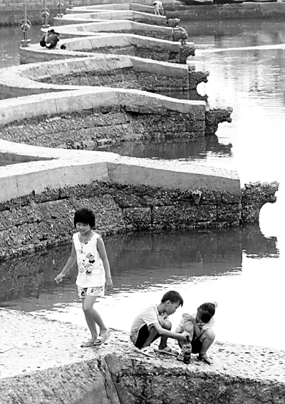 7月8日,儿童在山东威海九龙河的拦水坝上玩耍。目前,全国各地中小学以及幼儿园已陆续开始放暑假。家长应谨防儿童在没有家长陪同的情况下到海边、河边、湖边、水库边等存在安全隐患的场所消暑、玩耍。新华社发