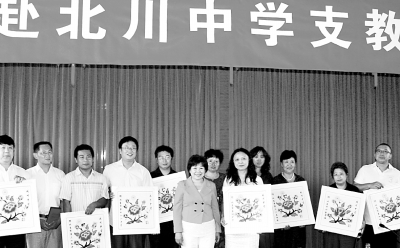 日前,北京市西城区教委和怡海教育集团举办了欢迎首批支教老师凯旋,欢送第二批支教老师启程活动。这是北川中学荣誉校长王琳达女士(左6)向老师们赠送羌绣。本报记者 刘新武摄
