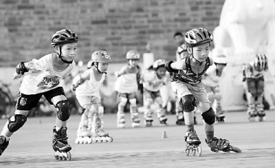 暑期,北京永定门城楼下,一群小朋友在老师的辅导下认真练习轮滑的简单动作。现在轮滑已成为广大青少年喜爱的健身活动,有的中小学还把轮滑运动纳入到体育课中。(本报记者 高腾摄)