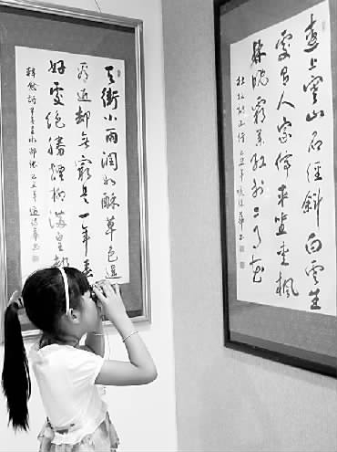 7月17日,来自江西兴国县实验小学的娄雨萱拿着玩具望远镜在欣赏书法作品。当日,由国家行政学院书画研究院等主办的边保华书法作品展在北京荣宝斋美术馆开幕。边保华为中国书法家协会会员,其作品有“既谨守有度,又畅叙幽情”之誉。(本报记者 王国平摄)