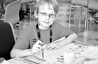 在维也纳大学的一间教室里,20多个孩子围坐在6张桌子旁,他们的面前放着毛笔、墨汁、宣纸和书法字帖。我走近一位正在握笔写字的女孩。她说,她叫雅仕敏,今年11岁,从未接触过中国书法,今天是第一次手握毛笔,虽然不知道写的字是什么意思,但手握毛笔的感觉很有趣。我告诉她,她的名字在中文里是“茉莉花”,中国有一首民歌来唱颂茉莉花。她表示要去找来听听。达尼尔虽只有9岁,却已是第3次参加“儿童大学”的学习。他告诉我,每次都是他自己想来的,因为在“儿童大学”能学到在学校里学不到的东西。他今年选了8堂课,除中国书法外,还有未来的汽车等。他也是第一次手握毛笔,手上的墨还涂到了脸上,不过字写得不错。再仔细看,发现他将字帖放在宣纸下面,是照着字帖描。真是个“有点子”的孩子。我问他为什么对中国书法感兴趣,他说,要是会写中国字,同学们会觉得他很“酷”。他愿意学习别人不知道的东西。埃马努艾今年12岁,是个黑孩子。他出生在牙买加,随父母来到维也纳。他喜欢画画,也喜欢中国,还选了“中国地理”课。他照字帖写的繁体字“笔”,将“竹”字头下的两点画成了两颗炯炯有神的黑眼珠,让“笔”字获得了生命。