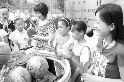 日前,山东省惠民县水利局的志愿者给留守儿童分发体育器材。今年暑期,惠民县建立了36家留守儿童活动站,组织县直和乡镇部门100多名青年志愿者,轮流到活动站陪留守儿童过暑假。 (本报通讯员王美健摄)