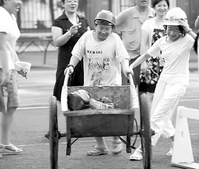 七月十八日,小选手在环保工人组的比赛中较量拉运速度。当日,江苏省南通市和平桥街道濠城社区举办的“我是小小劳动者”夏令营,百余名学生在市内不同区域,分组参加建筑铁军、快乐农民等项目的比赛。新华社发(黄哲摄)
