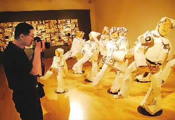 台湾著名艺术家朱铭7月18日携“人间系列”雕塑作品来到北京中国美术馆,与大陆观众分享三十年创作成果。此次展览将持续到8月13日,展出作品近150件,朱铭最新作品“人间系列———囚”也将首次公开发表。图为观众拍摄展出中的白彩系列作品。 (本报记者刘文嘉摄影报道)