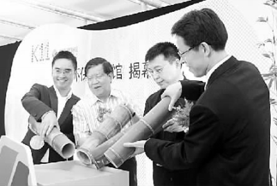位于北京市崇文区新景家园社区的K11环保体验馆于7月17日起对公众免费开放。馆通过展览与体验空间相结合的方式向公众介绍并分析绿色城市、绿色建筑的可能性。图为环保部副部长潘岳、二十国集团研究中心秘书长龙永图和K11创办人郑志刚等一起参与体验馆揭幕仪式。(本报记者吴潇怡摄)