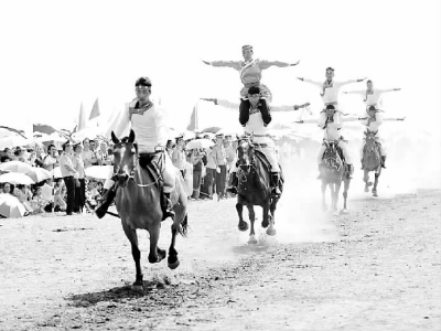7月25日,马队在开幕式上进行表演。当日,内蒙古自治区第21届旅游那达慕大会在乌兰察布市格根塔拉草原拉开帷幕,吸引大批中外游客前来参观,大会期间将进行赛马、摔跤等多项传统蒙古族体育竞赛项目的比赛。新华社记者刘勇贞摄