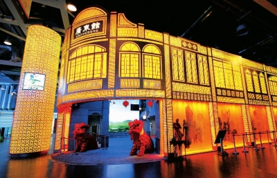 “你好!欢迎来到广东馆!”在骑楼正门口,两只醒目的机器南狮不断地用普通话、粤语和英语欢迎着来宾。参观者只要点一下两狮的眼睛,它们就会作揖相迎,栩栩如生。看,它还会扇扇耳朵、眨眨眼呢!只见西关小姐站在醒狮旁笑靥如花,穿着香云纱的衣服衬得格外美丽。