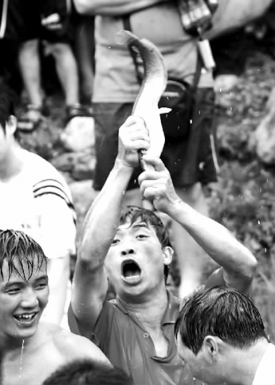 7月27日,村民们在闹鱼节上抢鱼。当日是农历六月十六,广西融水苗族自治县红水乡良双村举办第452届闹鱼节,村民们在小河里抓鱼抢鱼,其乐融融。闹鱼节是当地的传统节日,已举办了400多年,有预祝丰收之意。 新华社发(龙涛摄)