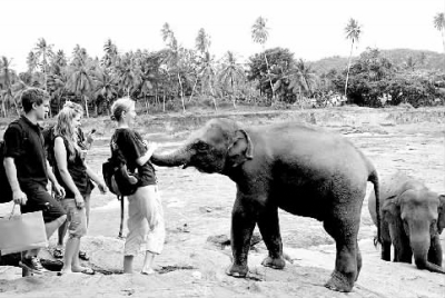 7月27日,斯里兰卡皮纳维拉大象孤儿院的小象与游客玩耍。位于斯里兰卡首都科伦坡东北约90公里处的皮纳维拉大象孤儿院设立于1975年,占地面积10公顷,主要用来收养在丛林中发现的大象孤儿。目前这所大象孤儿院的大象已经达到80多头,是世界上最大的人工饲养大象群。新华社发