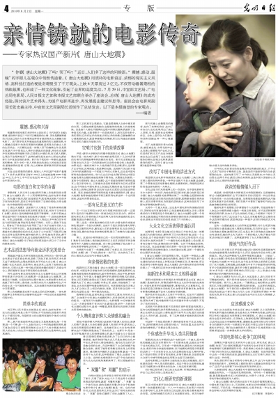 张建勇(中国电影艺术研究中心副主任、《当代电影》主编):震撼、感动和兴奋这三个词可以概括我的心情。首先是震撼和感动,可以说已经许久没有看到这样具有强烈现实主义震撼力的电影了。该片数字技术所制造出的逼真惨烈的大地震效果,令人震撼,但是影片给我们更强烈的震撼,是再现灾后唐山人民的生活状态。人们都说这是一部催人泪下的煽情之作,但是我发现,影片当中那些让人情不自禁流泪的段落,并没有在戏剧冲突高潮处使用煽情手段,它是那么朴素自然,而又感人肺腑,让观众不由得潸然泪下,这样的感动是发自内心深处的,源自影片当中复杂呈现的亲情。影片给予我的另一种感动,就是崇高和精神,影片中的一家人所投射出的唐山人民战胜灾害创伤,重建家园的坚韧、乐观、向上的精神,同样强烈而深刻地感动着观众。