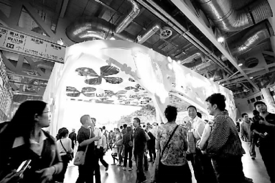 抬头一看,大厅中心悬坠着的幻影绣球更是夺人眼球。绣球直径在60-80厘米之间,外观时尚,通体为透明材质,内嵌4块显示屏,并通过照片传输技术完成即时成像,参观者走过幻影绣球底下时,绣球上便会映出相应影像。