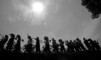 8月5日,建始县龙坪乡店子坪村的农民在去修公路的路上。湖北省建始县龙坪乡店子坪村贫穷偏远,为接通店子坪村至高坪镇青里坝村全长7.5公里的公路,自2004年以来,该村农民600多人自筹资金7万多元,单位帮扶12万元。他们发扬愚公移山的精神,在悬崖峭壁上修建公路。由于工程量巨大,建设难度大,目前还有2.3公里的路段待修。新华社发(杨顺丕摄)