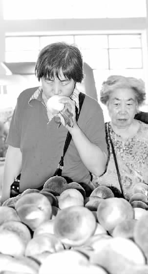 市民在“第二届平谷大集进京城暨农副产品展览会”上品尝平谷大桃(8月6日摄)。北京市平谷区曾被农业部命名为“中国桃乡”,此次摆进大集的大桃,全部应用了该区20年来探索出的40余项大桃科学种植管理技术,稳定了树势,果品增甜着色,实现平谷大桃100%无公害化种植。本报记者雷柯摄
