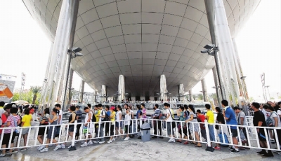 8月11日,游客在有着“月亮船”美誉的上海世博会沙特馆前排起长队。