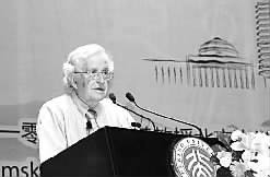 13日晚,乔姆斯基接受北大授予的名誉博士学位并发表题为“世界秩序勾勒:持续与变化”的演讲。北大百年纪念讲堂座无虚席,2000多位大学生以及语言学、哲学、数学、心理学、信息科学等相关领域的学者聆听了这位“当代认知科学之父”的演讲。