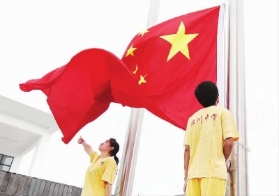 8月17日,北川中学的学生第一次在新校园里升起国旗。当日,新北川中学竣工典礼在北川新县城隆重举行。新北川中学是汶川地震灾后重建重点工程,这座由中铁二局承建的新校园总建筑面积达72000平方米,共有10个单体建筑,总投资近2亿元,这些重建资金全部由海内外华侨及爱心人士捐献。新华社记者 李桥桥摄