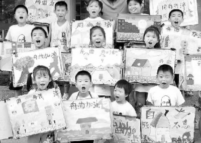 八月十五日,在洛阳市七里河附近街道上,小学生们展示自己创作的以舟曲洪灾为题材的绘画作品,为灾区祈福,当日,洛阳市跨世纪画廊组织数十名小学生走上街头,用稚嫩小手为舟曲描绘美好明天。新华社发