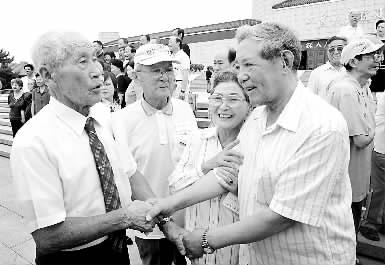 由朱新春所著的反映侵华日军飞行员筒井重雄经八路军教育后转入反战行列的传奇一生的长篇纪实文学———《樱花啊,樱花———一个日本飞行员的中国情结》一书,日前在中国人民抗日战争纪念馆举行首发式。筒井与几位曾在东北老航校帮助培养人民空军第一代飞行员的原日本飞行人员,在首发式上高兴地见到当年在航校学习的中国老朋友,他们的友谊已持续了60余年。筒井重雄(左)和山本米子(右二)等日本朋友与原武汉军区空军副政委李向民(右)相见,分外亲热。本报记者吴力田摄