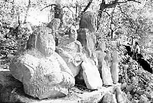 石像虽种类繁多,但大部分石像为座像“屈腿”呈“交趾”状,造型夸张,寓意奇特。“孕妇”石像体现了古人的生殖崇拜观念,骑象”将军像又与远古关于南方楚粤战争传说相符。文官像、武官像、将军像及普通士兵像等共同构成了神秘世界中的现实生活场景。