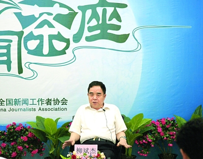 上图:新闻茶座上,国家新闻出版总署署长柳斌杰就相关问题发言并回答中外记者提问。