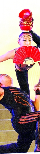 左图:北京文化志愿者在启动仪式上演出杂技《顶碗》。 新华社发(张宇摄)