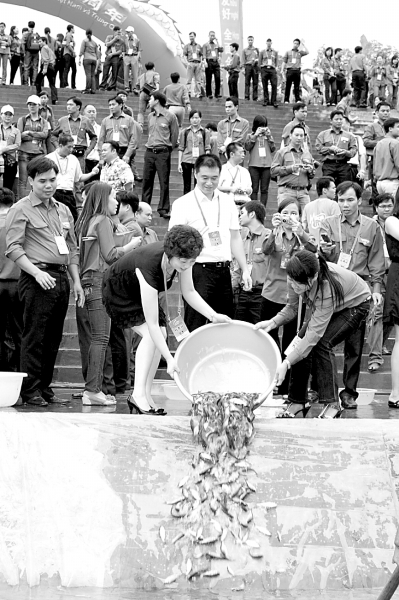 参加“中越青年大联欢”的数百位中越青年,今天在广西崇左市龙州水口码头开展了主题为“保护环境、促进生态平衡发展”的鱼类增殖放流活动。两国青年携手向中越边界界河投放了100多万尾鱼苗,以促进水生物的平衡发展,造福两国人民。图为两国青年正在向河中投放鱼苗。本报记者 刘军摄 |