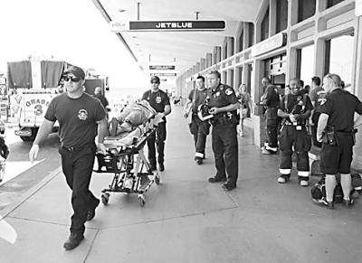 8月26日,美国捷蓝航空公司一架客机在萨克拉门托国际机场紧急降落,造成15人受轻伤。据悉,飞机在紧急降落前向地面指挥中心报告,机上的制动装置出现了故障。下图为乘客在飞机紧急降落后撤离。右图为一名受伤乘客被送往医院。