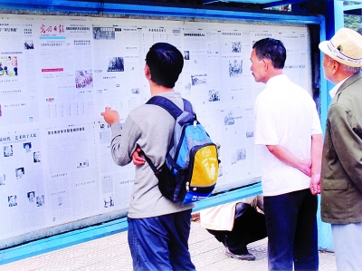 每天上午,昆明市民能通过读报栏看到当天《人民日报》和《光明日报》等党报的内容,这已成为昆明街市的一道人文风景。由昆明博览读书社和云南边防武警总队共建的公益读报栏,几经风雨困难,已在昆明主要街区挺立15年。目前,当天的200多份《光明日报》带着油墨清香出现在大街小巷。昆明博览读书社社长罗明生说:“各级党报很难在零售处买到,人民群众渴望了解党和国家的大事,我们在中间架起一座桥。”