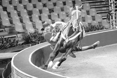 “梦幻潘多拉”环球城国际大马戏正在位于北京鸟巢附近的大篷剧场上演。俄法等多国演出团队及其狮、马等动物每晚在此为观众表演精彩的节目。图为哈萨克斯坦艺人表演的高超骑术。本报记者 吴力田摄