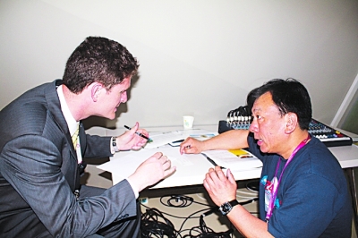 上图为本报记者刘军采访英国馆副馆长马丁及马丁先生为本报读者题词:欢迎来英国馆体验世博。大卫·马丁