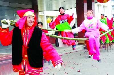 富裕起来的山东省枣庄市峄城区农民自发组织起民俗表演队沿街拜大年。10余支队伍带来了舞龙、舞狮、踩高跷、独杆轿、扭秧歌等民俗项目,精彩的表演让市民发出了“啧啧”的赞叹声。图为独杆轿表演。本报记者 邢兆远 通讯员 张大东摄