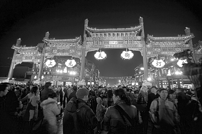 2月17日正月十五晚6时,前门大街上演明清时期。前门大街北端的两面灯墙、兔形灯、八面威风鼓和前门大街南口的10组十二生肖造型灯被同时点亮。据了解,从2月15日至17日,前门大街每天上午10时上演传统民俗走街表演,市民可以观赏到五福添财、舞龙舞狮、皇帝观灯、戏曲演唱、魔术、杂技、吆喝叫卖等精彩表演。本报记者 程伟光摄