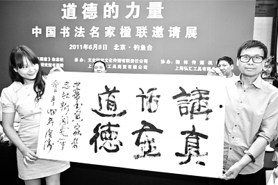 6月8日,书法家王广涛(右)展示作品“讲真话,重道德”。当天,由《中华书画家》杂志社、中央文史研究馆书画院主办的“——中国书法名家楹联邀请展”新闻发布会在北京钓鱼台举行,展览将于7月底中央文史研究馆成立60周年之际举办。