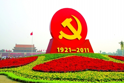 为庆祝中国共产党90华诞,北京天安门广场中心布置“红心向党”主题花坛。