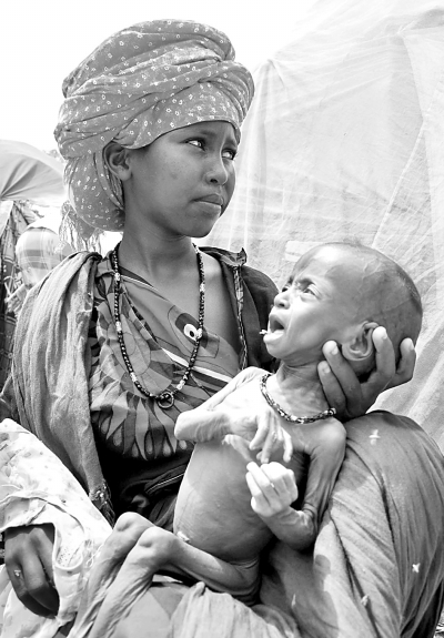 7月26日,在索马里首都摩加迪沙的一个难民营,一名来自索马里干旱地区的妇女抱着自己严重营养不良的孩子。