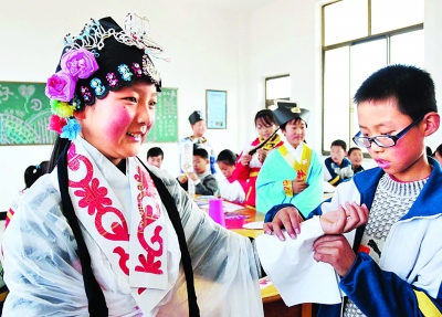 11月15日,山东省乳山市午极镇午极小学五年级一班的学生正在试穿自己制作的低碳戏曲服装。当日,在该校举办的“传统戏曲文化进校园”活动中,学生们利用包装袋、挂历、纸盒等废旧物品,制作低碳的京剧、吕剧、越剧等传统戏曲头饰、脸谱、服装。 本报记者 刘新武 本报通讯员 张海凤摄