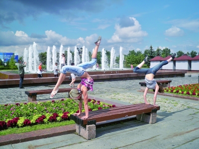| 并蒂莲 红花地,碧云天,绿树绕喷泉。俄少女,何翩翩,宛若并蒂莲。(日常生活类三等奖 驻俄罗斯使馆刘龙摄) |