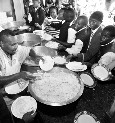 10月16日,在肯尼亚首都内罗毕共和国高级中学,学生们在食堂打饭。当日是世界粮食日。据联合国世界粮食计划署当天发布的统计数字显示,过去20年间全世界饥饿人口减少了1.32亿,然而目前全球仍有接近8.7亿人口长期营养不足。今年世界粮食日的主题是“办好农业合作社,粮食安全添保障”。 新华社发