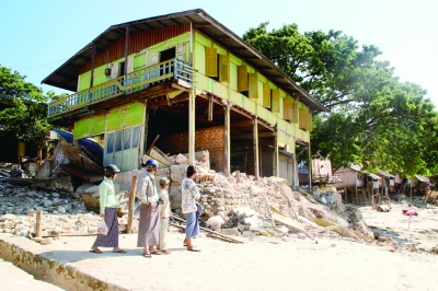 11月12日,缅甸地震灾区曼德勒省的德坯珍镇,当地居民查看被地震损毁的房屋。缅甸北部11日上午发生里氏6.8级地震,震中位于曼德勒省和实皆省交界地区。据官方不完全统计,地震已造成至少6人死亡、64人受伤。各项救灾工作现已展开。新华社发