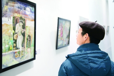 11月13日,“意会中国——孟加拉国青年艺术家来华采风创作作品展”在北京通州宋庄艺术区国中美术馆举行。参展的6位孟加拉国艺术家的40余幅作品,代表了孟加拉国当代青年艺术群体的艺术水平、艺术取向及发展现状。此展及相关的采风创作活动由文化部主办,中国对外文化集团公司及中国对外艺术展览有限公司承办。图为观众在欣赏画作。 本报记者 蒋新军摄