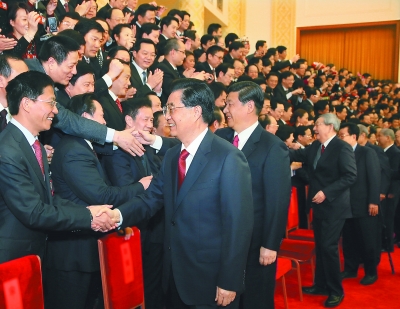 11月15日,国家主席胡锦涛,新当选的中共中央总书记、中共中央军委主席习近平等领导同志在北京人民大会堂亲切会见出席党的十八大代表、特邀代表和列席人员并发表重要讲话。 新华社记者 鞠鹏摄