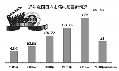 今年,仅第一季度,全国城市影院电影票房收入就超过52亿元,其中国产片36亿元,约占69%;共有11部影片票房过亿,其中6部是国产片,《西游降魔篇》以12.5亿元荣登榜首,其他五部影片分别是《一代宗师》《北京遇上西雅图》《101次求婚》《快乐大本营之快乐到家》《喜羊羊与灰太狼之喜气羊羊过蛇年》。
